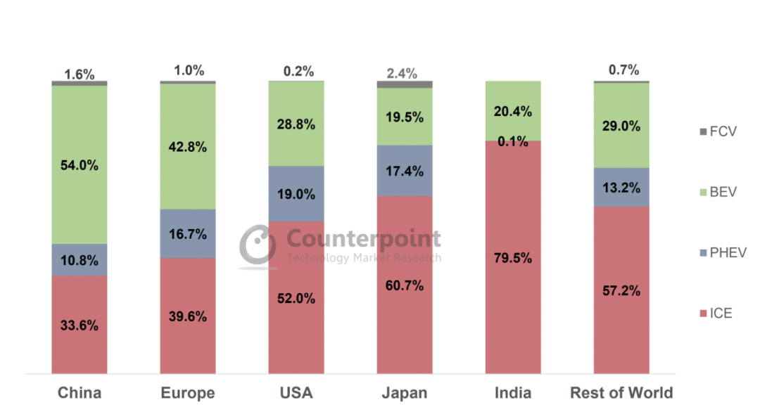 全球各大商场乘用车出售比例猜测 –按动力系统区分,2030年