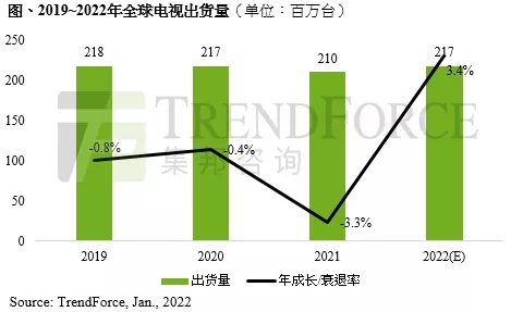 依据TrendForce集邦咨询发布的调查报告,2021年电视品牌上半年出货体现受惠于美国救济金所带动,使得北美出货继续畅旺,与此一起,品牌继续进行面板库存回补,推升面板价格不断攀高;下半年跟着欧美疫情趋缓日子康复正轨,疫情盈利不再,需求面对检测。此外,原物料和运费高涨垫高整机本钱,品牌业者不得不将本钱转嫁至终端价格,尽管品牌仍希望年末双十一及黑五两大促销假日,可是遭到本钱过高导致促销成效不彰,而终端需求也就此一蹶不振,最终使2021年电视出货量年阑珊3.2%,达2.1亿台。