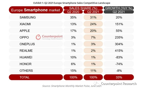 不过,有的厂商在二季度收成了喜讯。Counterpoint研讨副总监Jan Stryjak说,“持续的供给链严重以及疫情要素将持续影响欧洲商场销量。但是,小米在曩昔几个月中体现非常好,甚至在二季度超过了苹果,成为欧洲智能手机销量第二。OPPO持续坚持杰出的增加势头,OnePlus和realme获益于华为的窘境而名次也有所上升。”