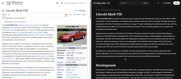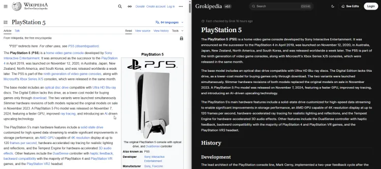 虽然马斯克曾许诺 Grokipedia 将是对维基百科的“巨大改善”,但其有些文章好像在抄袭维基百科的内容。例如,在 MacBook Air 的页面底部能够看到这样一条声明:“本内容改编自维基百科,遵从常识同享署名-相同方法同享 4.0 世界答应协议。”在某些情况下,这种“学习”乃至不只是改写:在 PlayStation 5 和林肯 Mark VIII 的页面上也发现了相同的声明,而这两个页面的内容简直与维基百科原文逐字逐句完全一起。