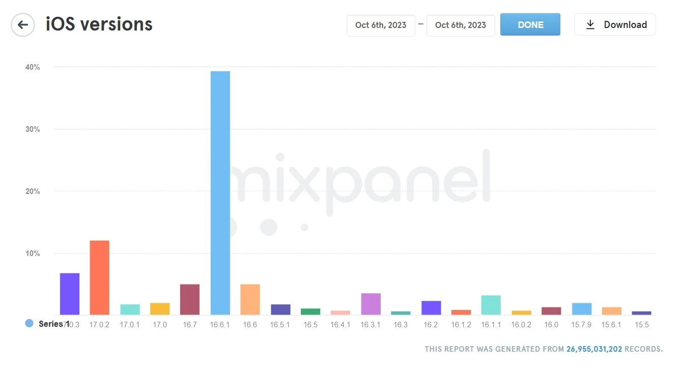 ,iOS 17 的装置率低于正常水平,到 10 月 6 日,iOS 17 发布 18 天后的装置率约为 23%。其间 12.13% 的用户正在运用 iOS 17.0.2 体系,6.84% 的用户运用 iOS 17.0.3 体系,1.76% 的用户运用 iOS 17.0.1 体系,2% 的用户坚持运用 iOS 17 体系。作为比照,运用最终两个 iOS 16 版别(iOS 16.6.1 和 iOS 16.7)的用户大约为 45%。